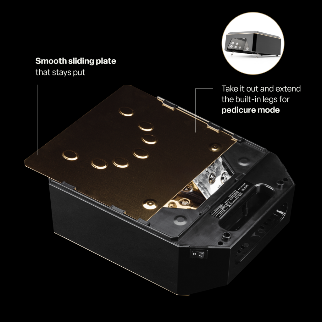 To use the Nova LED Lamp in pedicure mode, remove the bottom nail plate and pull out the hidden legs from both sides to elevate the lamp, then place your foot into the lamp. Use the MODE and timer button settings as instructed for manicure use.